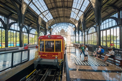 Là một trong những sản phẩm độc đáo của khu du lịch Sun World Fansipan Legend, tàu hỏa leo núi Mường Hoa ở độ cao 1600m đưa du khách từ Sun Plaza tại thị trấn Sa Pa qua một hành trình vô cùng lãng mạn dài gần 2km, khi ngồi trên con tàu đỏ rực với thiết kế cổ điển, sang trọng, để “bay” trên những cung đường đẹp nhất của thung lũng Mường Hoa, qua 2 hầm và 4 cầu cạn tới ga đi cáp treo Fansipan. Từ trên cao giữa lưng chừng núi, qua ô cửa kính trong veo của tàu hỏa leo núi Mường Hoa, du khách sẽ được thu vào tầm mắt khung cảnh hùng vĩ của núi rừng Tây Bắc mướt xanh màu lúa, ngô, màu rừng, thấy khói lam chiều vấn vương trên những nếp nhà trong bản.