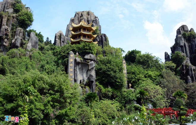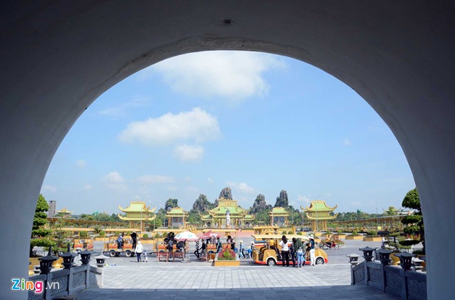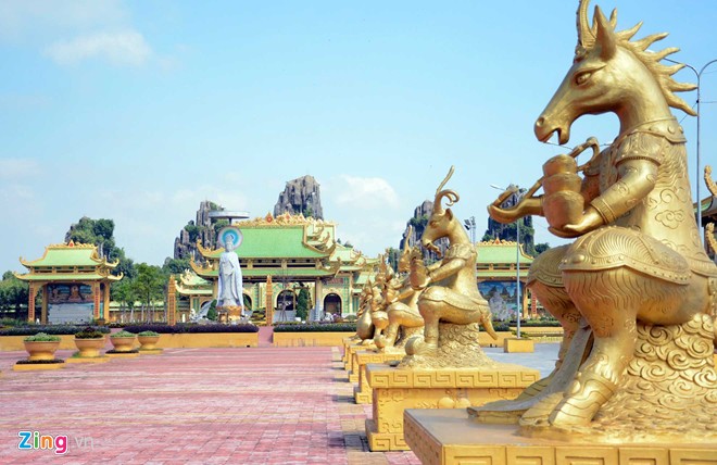 Các khu Kim điện, khu thờ tự, đền, đài, tháp được kết hợp độc đáo với núi, non, sông, hồ, cây cảnh. Dãy Bảo Sơn - Ngũ hành sơn bao gồm 5 ngọn: Kim - Mộc - Thủy - Hỏa - Thổ, ngọn trung tâm cao 65,8 m, là dãy núi nhân tạo dài nhất Việt Nam với chiều dài 252 m. Trấn giữ ở phía tây của dãy Ngũ Hành Sơn là thần Bạch Hổ, phía Đông là Thần Núi và Thần Nông. Và đặc biệt, đây cũng là nơi cư trú của hàng ngàn chim yến, biểu hiện của một vùng “đất lành chim đậu”. |