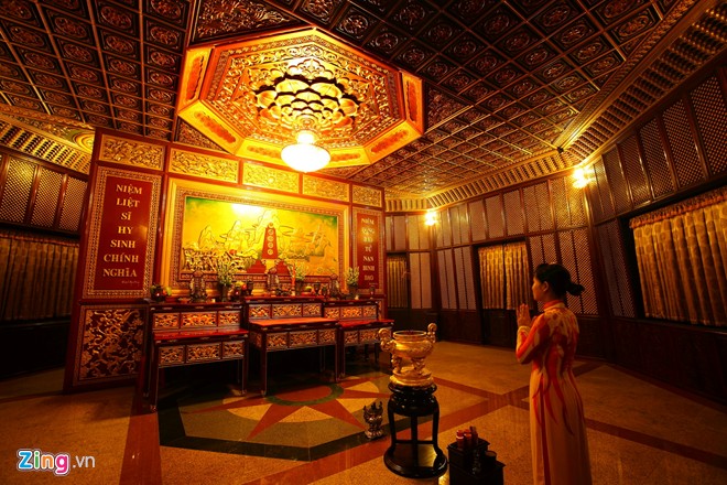 Chính giữa của mái vòm là điểm vọng âm. Đứng tại điểm vọng âm, âm thanh sẽ được khuyếch đại và truyền đi khắp Kim điện. Trên nền 28 bộ khung bao cửa được chạm trổ 28 bộ tranh lịch sử tiêu biểu, đánh dấu các mốc son lịch sử của Việt Nam. |