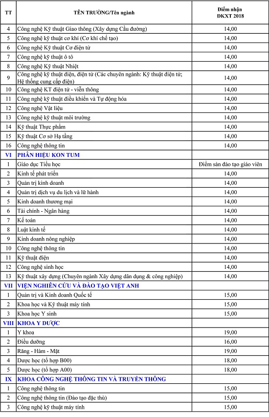 Năm nay, các trường thành viên thuộc ĐH Đà Nẵng xác định mức điểm sàn thấp nhất là 14. Nhiều ngành có mức điểm sàn là 15, 16 và cao nhất là ngành Y khoa (Khoa Y dược) là 19.