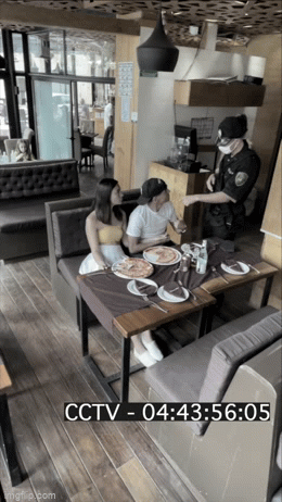 Sau đó, cô gái đã tận dụng lúc bạn trai không chú ý, lén viết một dòng chữ lên tờ giấy ăn trên bàn và khéo léo dúi tờ giấy vào tay nữ nhân viên khi người này mang pizza tới. Trong lúc quay lại quầy thanh toán, nữ nhân viên này đã đọc được dòng chữ trên tờ giấy và trao đổi với nam đồng nghiệp đứng kế đó. Theo đó, 2 nhân viên này đã phối hợp với nhau để đánh lạc hướng vị khách và gọi cảnh sát.