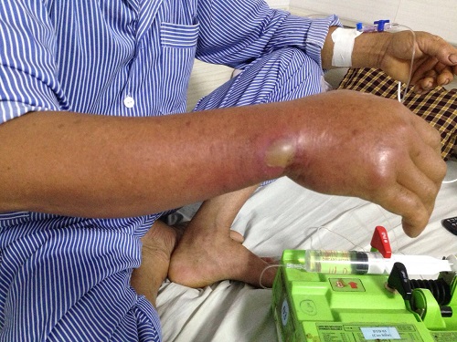 Bệnh nhân tên là N.V.T. 54 tuổi, (trú tại huyện Hạ Hòa, Phú Thọ) nhập viện điều trị vào ngày 21/6, trong tình trạng sưng đỏ, nóng ran cánh tay phải. Cổ tay phải có mụn mủ kích thước lớn, hạn chế vận động cổ tay phải.