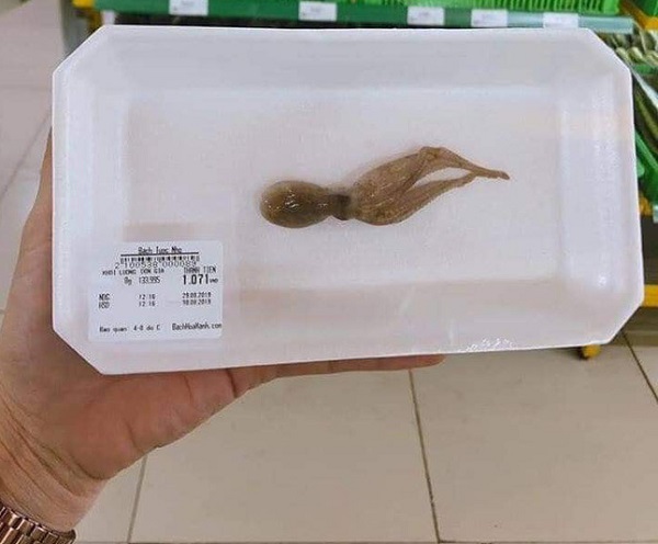Theo đó, mạng xã hội đang thi nhau chia sẻ bức ảnh đi siêu thị mua đúng một con bạch tuộc to bằng ngón tay. Để có được 1 bữa hải sản theo đúng nghĩa với số tiền hạn hẹp, chàng thanh niên đã "đánh liều" mua hẳn con bạch tuộc với giá chỉ 1.071 đồng, lại còn được bọc trong khay nhựa cẩn thận.
