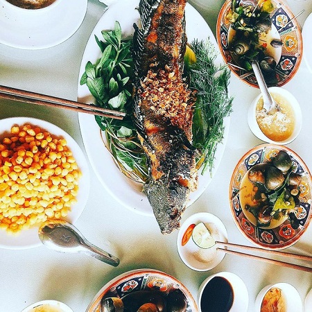 Menu đồ ăn ở đây đa dạng, từ các món ăn trong bữa cơm hàng ngày như canh cua cà pháo, đậu phụ tẩm hành đến ăn sang hơn như cá chìa vôi nướng, lẩu riêu cua, lẩu sườn sụn... được chế biến rất vừa miệng, đúng chuẩn ẩm thực đất Kinh Kỳ. Bạn có thể gọi tùy theo nhu cầu và sở thích của gia đình. Nhà hàng này vốn là địa chỉ quen thuộc với nhiều thực khách Thủ đô.