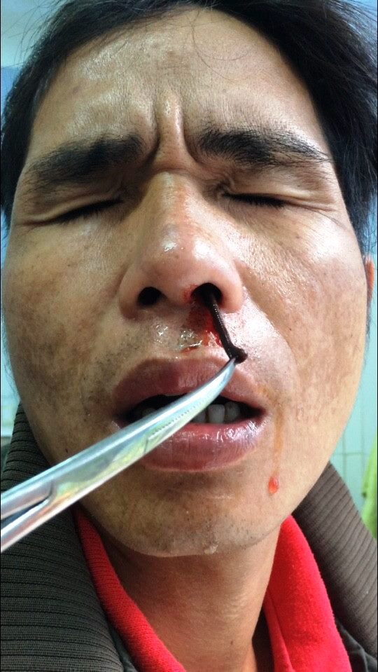 | Bệnh nhân được bác sĩ gắp đỉa khỏi mũi |