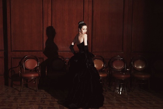 Trong tạo hình thứ hai, Nhiệt Ba như hóa thân thành minh tinh Hollywood Audrey Hepburn thanh lịch và đầy quyến rũ trong bộ đầm nhung đen, găng tay cùng màu và tóc búi cao với phụ kiện ngọc trai. |