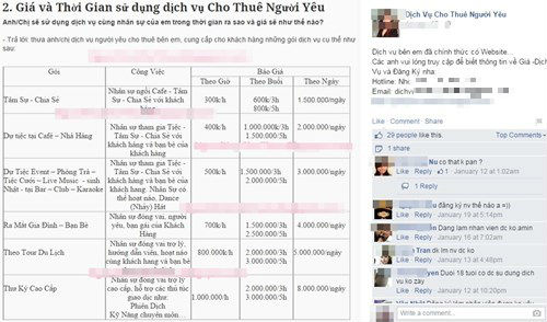 Trong những năm vừa qua, cứ mỗi dịp lễ, tết là dịch vụ cho thuê người yêu lại nở rộ. Dịch vụ này hướng đến những người đang cô đơn chưa có người yêu. Chỉ cần gõ từ khóa cho thuê người yêu trên mạng là bạn sẽ tha hồ lựa chọn cho mình những gói phù hợp với mục đích và túi tiền.