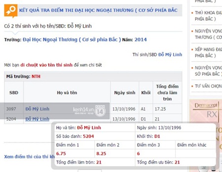 Điểm thi đại học vào khối A1 và D1 của Đỗ Mỹ Linh. |