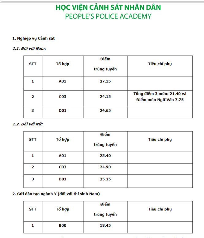 Nghiệp vụ cảnh sát: Nam (A01) 23,85 điểm; (C03) 23,9 điểm, tiêu chí phụ tổng điểm 3 môn 21,4 điểm và môn văn 7,25 điểm; (D01) 22,95 điểm, tiêu chí phụ tổng điểm 3 môn 22,2 điểm. Nữ (A01) 24,4 điểm; (C03) 23,6 điểm; (D01) 24,2 điểm. Gửi đào tạo ngoài ngành: (B00) 18,45 điểm