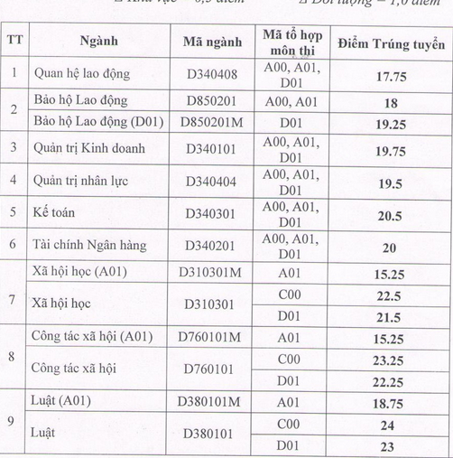 Theo ngưỡng điểm công bố của hệ Đại học, điểm chuẩn của tất cả các tổ hợp dao động trong khoảng từ 15,25 đến 24 điểm. Trong đó, ngành xã hội học có điểm chuẩn thấp nhất với 15,25 điểm, ngành Luật có điểm chuẩn cao nhất với 24 điểm. Các ngành công tác xã hội, quản trị kinh doanh, tài chính ngân hàng... cũng có mức điểm tương đối cao.