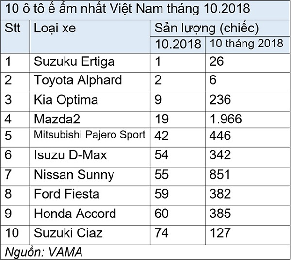 Hiệp hội các nhà sản xuất ô tô Việt Nam vừa công bố danh sách những mẫu xe bán ế nhất tháng 10/2018 với số lượng bán ra chỉ đếm trên đầu ngón tay.