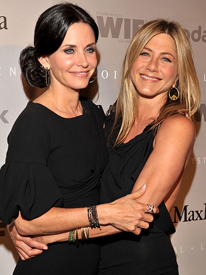 Đôi bạn thân của "Friends" thể hiện tình cảm thắm thiết cả ngoài đời khi Jennifer Aniston trở thành mẹ đỡ đầu cho con của Courteney Cox. |