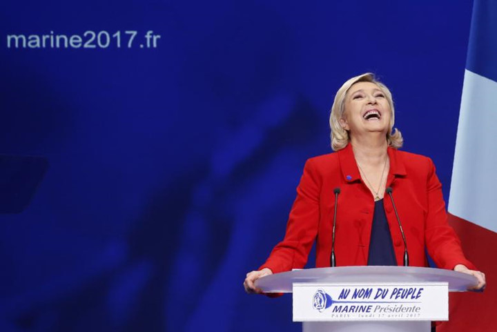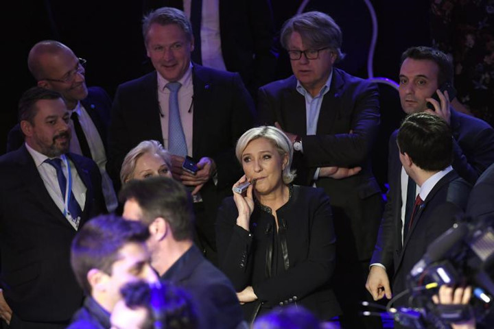 Marine Le Pen, lãnh đạo đảng cực hữu Mặt trận Dân tộc Pháp, tại một buổi tập hợp ở Paris. Theo một cuộc thăm dò, bà đang xếp thứ nhì. |