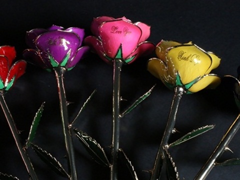 Hoa hồng sơn mài dát vàng 24k được làm từ hoa hồng thật bên trong và được mạ bởi vàng 24k. Sản phẩm được nhúng vào sơn mài đỏ, và được tỉa tỉ mỉ bằng vàng 24k. Đây là một món quà tặng hoàn hảo và phong phú, bởi nó được pha trộn rất nhiều gam màu sắc rực rỡ, ấn tượng khác như xanh dương, vàng, hồng baby, hồng đậm, tím thủy chung,… Mỗi cành hoa có chiều dài khoảng 28-31cm, được đóng gói cẩn thận và sang trọng trong một hộp quà. Sản phẩm có giá khoảng 1 triệu đồng.