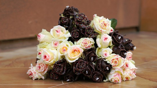 Năm nay, thị trường quà tặng 8/3 xuất hiện loại hoa hồng phủ chocolate mỏng với màu sắc bắt mắt, giá bán khoảng 250.000 đồng một cành, được nhiều người đặt mua làm quà tặng. Lớp chocolate này không làm mất đi độ tươi của hoa và cũng không bị tan chảy trong điều kiện bình thường.