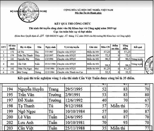 Theo thông tin, thí sinh này có tên là Cấn Việt Tuấn (SBD 203, thi vào vị trí Chuyên viên HTQT tại cục An toàn bức xạ và hạt nhân, bộ KH&CN). Thí sinh này có kết quả bài thi trắc nghiệm vòng 1 là 35/100 điểm, và sau khi chấm phúc khảo, điểm bài thi được nâng lên 63/100 điểm. Như vậy, với 28 điểm được nâng, thi sinh Cấn Việt Tuấn đã từ “trượt” thành “đỗ” và tiếp tục được dự thi vòng 2.