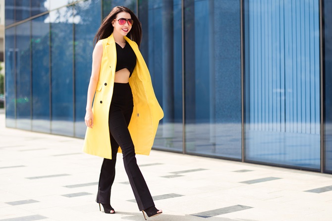 Với những ngày trời Đông hửng nắng, cô nàng diện áo khoác dài màu vàng không tay của Dior kết hợp với quần tây ống loe cổ điển, áo crop top khoe trọn vòng eo thon gọn, quyến rũ.