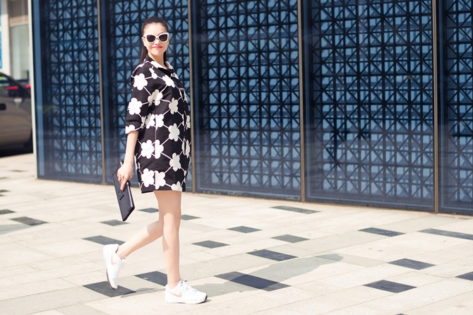 Cô nàng trẻ hoá và tạo sự quyến rũ của trang phục khi kết hợp với quần ngắn và giầy thể thao.