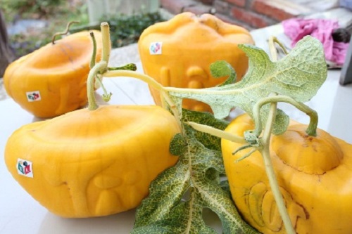Cận cảnh những trái dưa tạo hình “Tài – Lộc”. |