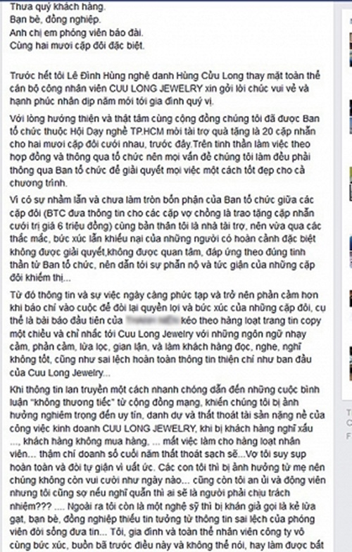 Mới đây, diễn viên - doanh nhân Hùng Cửu Long (Lê Đình Hùng) đã vô cùng bức xúc khi chia sẻ một tâm thư dài trên trang cá nhân và nhận được nhiều sự quan tâm, chia sẻ của bạn bè trên facebook