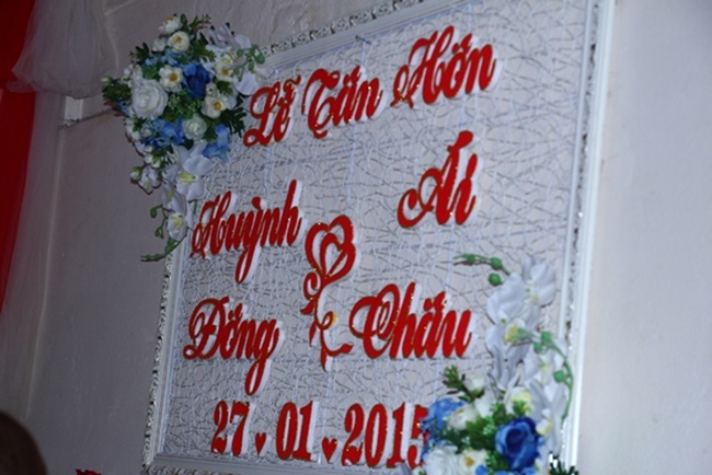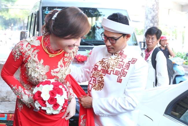 Chú rể Huỳnh Đông xuất hiện với bộ áo dài khăn đóng màu trắng sang trọng bên cạnh cô dâu Ái Châu mặc áo dài màu đỏ rực rỡ. Cô dâu Ái Châu rang rỡ trong niềm hạnh phúc khi nhận được sự quan tâm từ chồng và gia đình. Chú rể Huỳnh Đông còn dành tặng vợ nụ hôn ngọt ngào.