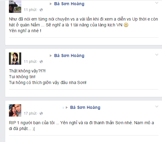 Bạn bè gửi lời trên Facebook mong Bá Sơn yên nghỉ, ra đi thanh thản. |