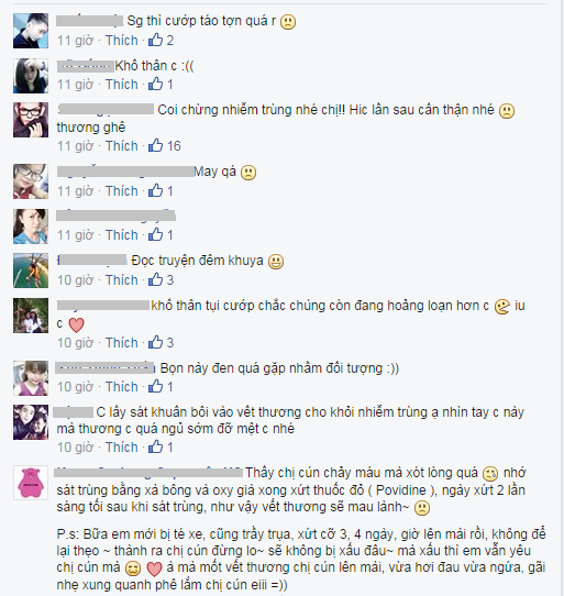 Nói chung chị em hết sức cảnh giác vì em đi ngoài đường cực kỳ ít mà còn bị cướp như thế, mà nếu là cô gái bình thường thì bị cướp mất giỏ xách rồi. Không phải ai cũng bình tĩnh và khoẻ như em để giằng co với mấy thanh niên chuyên ăn cướp giật như vậy.