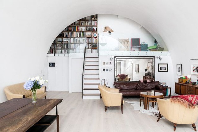 Phòng khách ngăn nắp và hiện đại với mái vòm cong. Để tiết kiệm diện tích sử dụng, phần trần được thiết kế như một gác xép nhỏ để chứa sách và phòng đọc, hiện ngôi nhà đang được rao bán với giá hơn 30 tỷ đồng. |