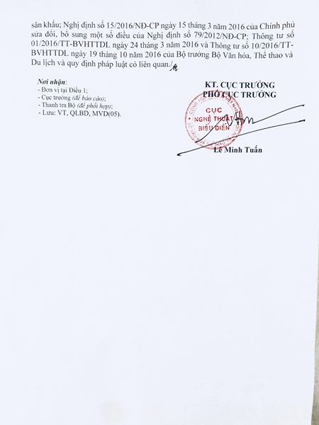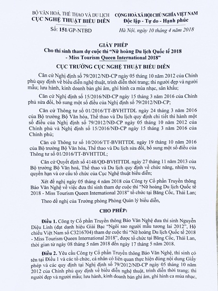 Hiện tại, Cục Nghệ thuật biểu diễn cũng đã chính thức cấp giấy phép cho Nguyễn Diệu Linh tham gia cuộc thi.