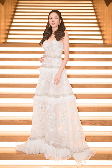 | Hoa hậu Du lịch toàn cầu Diệu Linh chọn bộ váy trắng của NTK Đỗ Long. Bộ trang phục được thiết kế thanh lịch khoe đôi vai hờ hững và tạo sự kín đáo chuẩn mực ở phần đuôi váy vừa vặn theo phom dáng của người mặc. |