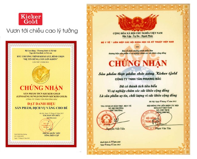 Kicker Gold đã có mặt tại Việt Nam từ năm 2006 và được Bộ Y Tế trao tặng danh hiệu “Biểu tượng vàng vì sức khỏe cộng đồng”, đồng thời giành được danh hiệu “Sản phẩm, Dịch vụ Vàng cho Bé” do độc giả trên tạp chí Gia đình & Trẻ em bầu chọn năm 2015.