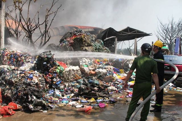 Xưởng sơ chế phế liệu ở Thái Bình bốc cháy dữ dội giữa trưa. Ảnh: Dân trí |