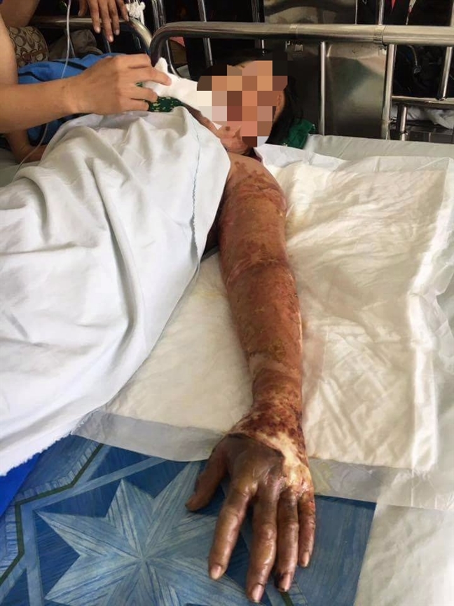Vụ phóng hỏa khiến Hoàng bị bỏng gần như toàn thân; chị M. bỏng 60% cơ thể, vết thương ở mặt do dao cứa phải khâu 20 mũi; cháu bé bị bỏng nhẹ.