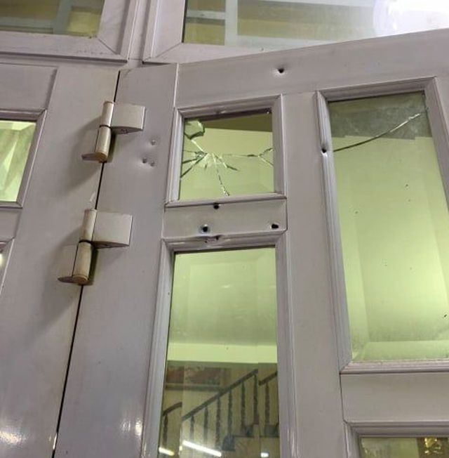 Cửa nhà chị B. có nhiều vết thủng do súng bắn đạn hoa cải gây ra - Ảnh: Dân trí |