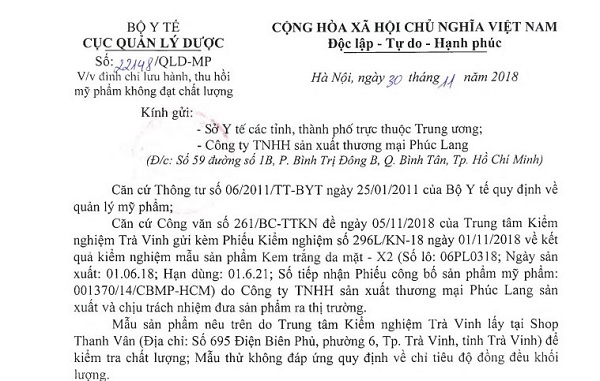 Chính vì vậy, Cục Quản lý Dược đã tiền hành đình chỉ lưu hành trên toàn quốc toàn lô sản phẩm Kem trắng da mặt – X2, số lô 06PL0318, ngày sản xuất 1/6/2018, hạn dùng 1/6/2021, số tiếp nhận phiếu công bố sản phẩm mỹ phẩm 001370/14/CBMP-HCM, do Công ty TNHH sản xuất thương mại Phúc Lang sản xuất và chịu trách nhiệm đưa sản phẩm ra thị trường.