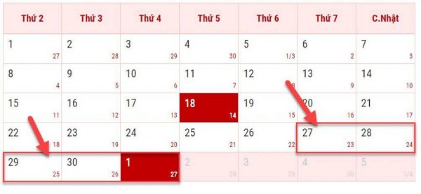Lịch nghỉ lễ dịp lễ 30/4 và ngày Quốc tế lao động 1/5, người lao động nghỉ 2 ngày nhưng do giữa ngày nghỉ lễ và ngày nghỉ cuối tuần (27 – 28/4) có ngày thứ 2 (29/4) xen kẽ nên Thủ tướng Chính phủ đã đồng ý cho phép hoán đổi nghỉ ngày thứ hai (29/4) và đi làm bù vào thứ bảy (4/5).