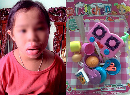Mấy ngày qua, anh Nguyễn Tuấn (Biên Hòa, Đồng Nai), chú của cháu N khá lo lắng về tình trạng sức khỏe của cháu gái. Anh cho biết bộ đồ chơi gia đình mua tặng cháu N có tên Kitchen với nhiều màu sắc sặc sỡ. Chúng được mua tại một cửa hàng ven đường với giá chưa đến 100 nghìn đồng. Đến nay, môi của cháu N đã giảm sưng nhưng vẫn còn tấy đỏ.