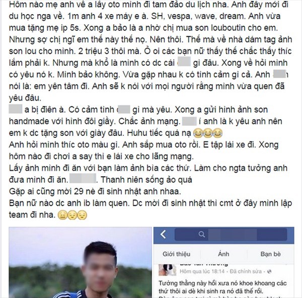 Và thật tiếc khi anh chàng có tên N.T.T.S lại rơi vào trường hợp như thế. Câu chuyện dở khóc, dở cười về một chàng trai liên tiếp bị các cô gái đua nhau bóc mẽ là "sống ảo" này đang được cư dân mạng quan tâm chia sẻ, bàn luận rất nhiều. Mọi việc bắt đầu từ một dòng trạng thái lên tiếng "tố" N.T.T.S cưa cẩm rất nhiều cô gái, với ai cũng vừa quen chưa được bao lâu đã "nhận vơ", đòi được facetime, đi cafe, rồi ôm hôn; và đỉnh điểm nhất có lẽ là việc T.S luôn "chém gió" về gia thế giàu có, sở hữu ô tô nọ, xe máy kia, hứa hẹn sẽ mua quà cho các cô gái mà mình cưa cẩm, nhưng rốt cục thì anh chàng này chỉ là "thùng rỗng kêu to" mà thôi.