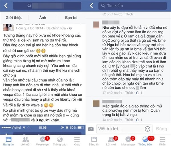 Bạn gái có Facebook B.T.T đã chia sẻ rằng: "Bây giờ dính phốt mới biết nhiều bạn gái cũng giống mình từng bị nó mở mồm ra khoe sang chảnh này nọ, nhà anh thế này thế kia. Vẫn còn nhớ cái câu chua nhất của nó là: Hôm nay anh lên đón em đi chơi nhé, ôi thôi chết rồi chắc hôm nay anh phải đi SH rồi vì không thấy chìa khóa xe Vespa đâu. Một lúc sau lại ôi tìm mãi không thấy chìa khóa xe Vespa đâu chắc hôm nay anh phải đi xe Liberty rồi. Và rồi anh ấy đi xe Wave ạ". Được biết S.T đã tán tỉnh bạn gái này cách đây tầm một năm. Tuy khi đó đã biết anh chàng này có thói quen khoe mẽ và xấu tính nhưng B.T.T không hề công khai. Cho đến mới đây khi biết có nhiều người khác nữa cũng "dính chưởng" nên đã kể lại câu chuyện của mình.