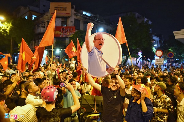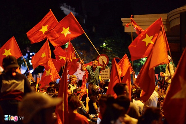 Sau khi kết thúc trận đấu kịch tính với Malaysia với chiến thắng 2-0 nghiêng về Việt Nam, hàng nghìn người hâm mộ nhanh chóng đổ ra đường ăn mừng.