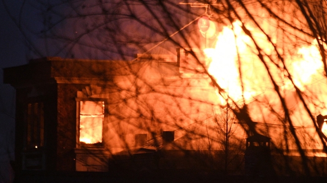 Ngọn lửa bùng lên từ ngôi nhà mà ông Bardanov cố thủ. Ảnh: Sputnik |