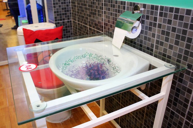 | Chị Hương, chủ quán cho biết : "Phong cách quán cà phê này đã có tại nhiều quốc gia, nhưng ở Việt Nam còn khá mới lạ nên khách hàng cũng có phần ngượng ngùng khi lần đầu đến quán. Hầu hết ghế ngồi ở đây được làm từ những chiếc bồn cầu thật, quán đã mất 3 tháng để thi công, với chi phí hơn 1 tỷ đồng". Trong ảnh là bàn ăn có chậu rửa mặt bên dưới. Khăn giấy cũng được sắp đặt như hình ảnh thường thấy trong nhà vệ sinh. |