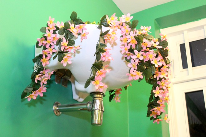 | Bồn rửa mặt thành chậu hoa trang trí trên tường. |