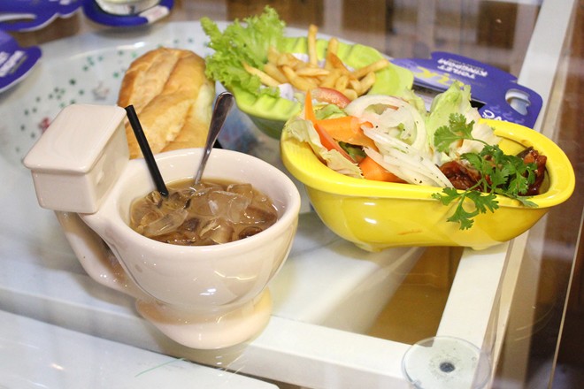 Với ghế ngồi bằng bồn cầu, thức ăn được đựng trong tô hình bồn tắm... một quán cà phê trên đường D2, quận Bình Thạnh (TP HCM) khá hút khách vì cách trang trí ấn tượng.