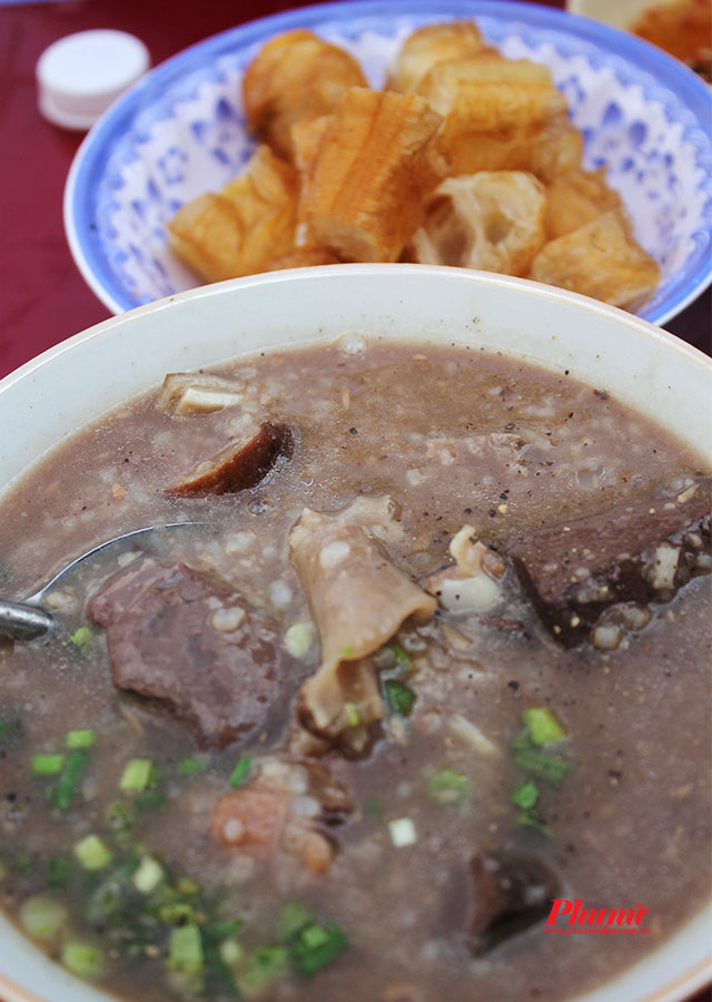 Cháo có màu xỉn hơi ngả đen nhờ được nấu cùng huyết tươi được pha chế và luộc theo công thức gia truyền. Nước ngọt của cháo lòng cũng do huyết tươi tạo ra. Thay vì xài huyết bán sẵn thì quán của bà dùng huyết vì được pha và luộc tại nhà nên đạt được độ mềm, dai vừa đủ.