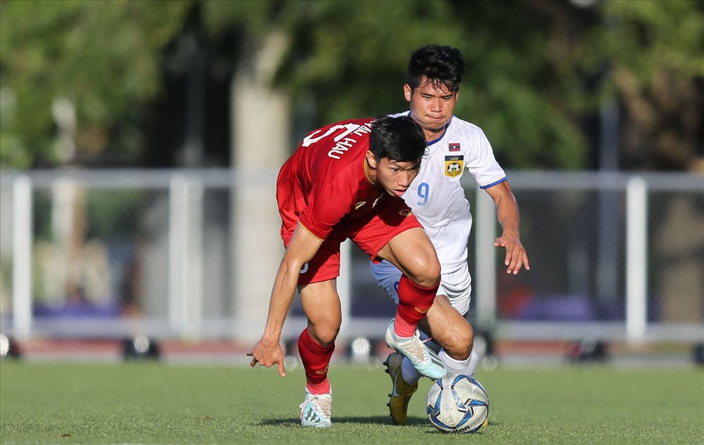 Đoàn Văn Hậu có thể hình vượt trội so với các cầu thủ U22 Lào. |