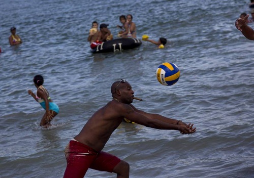 Một người đàn ông đang chơi bóng chuyền trên bãi biển tại Matanzas, Cuba vào một ngày tháng 7 rực nắng. |