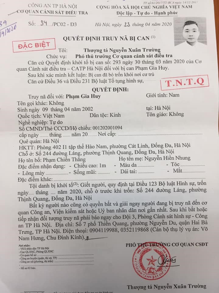 Quyết định truy nã của cơ quan công an với đối tượng Phạm Gia Huy. Ảnh: Công an Hà Nội |