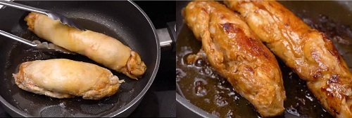 Gà cuộn sau khi hấp thì gỡ bỏ giấy bạc ra. Đun nóng một ít dầu ăn trong chảo, cho gà cuộn vào chiên chín vàng đều. Khi gà đã chín vàng đều bạn hãy dùng cọ quét nước xốt BBQ đều lên miếng gà cuộn và chiên thêm khoảng 1 phút là xong. Lấy thịt gà cuộn ra cắt miếng vừa ăn.