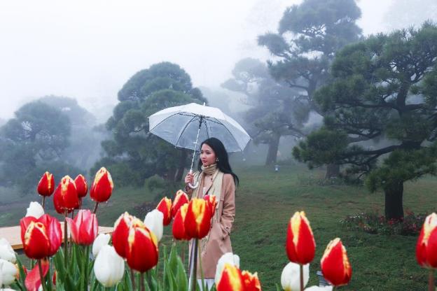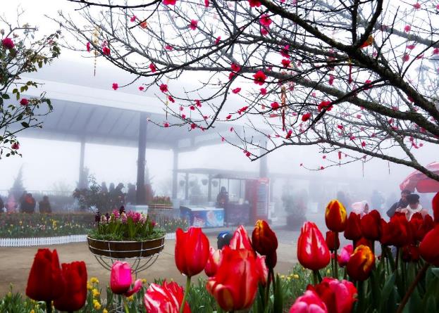 Cả một “con đường xuân” với hoa đào, hoa mận bung nở trong sương giá, dưới nắng bừng, những triền hoa cải vàng rực rỡ, những vạt tulip kiêu sa… dẫn lối du khách tới khu du lịch Sun World Fansipan Legend.